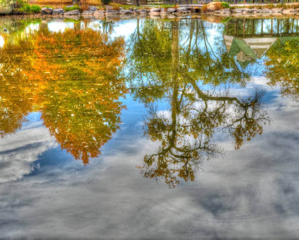 Reflections at Sterne Park, Littleton CO by Cindy Herbella. Sony a7iii, f/9, 1/125 sec, ISO 100, underexposed 3/4 stop Geranium by Cindy Herbella. Composite of multiple images, focus-stacked using a 90mm Tamron macro lens. Sony a7iii, f/4, 1/800 sec, ISO 100, underexposed 1 1/3 stops